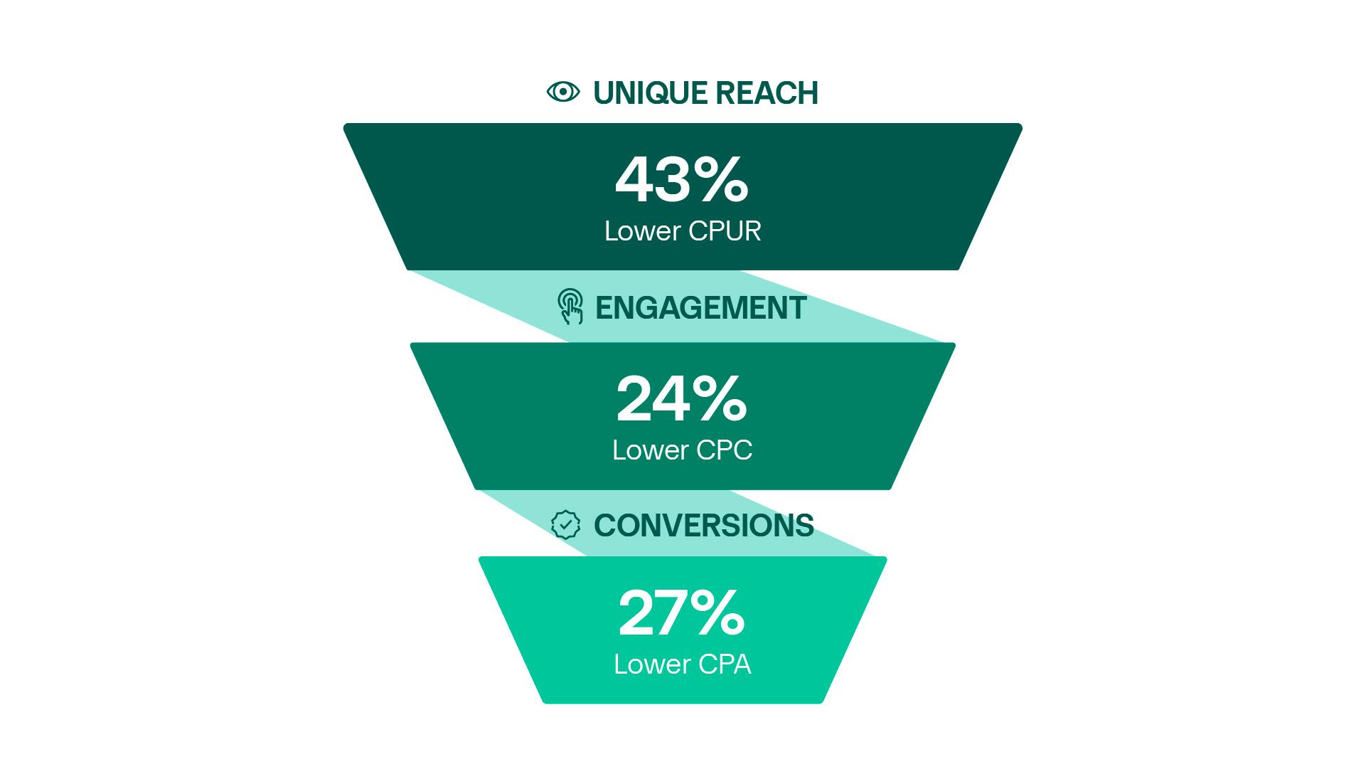 Our platformwide data analysis revealed that campaigns running through Kokai have delivered, on average, 43% lower cost per unique reach (CPUR), 24% lower cost per click (CPC), and 27% lower cost per acquisition (CPA).