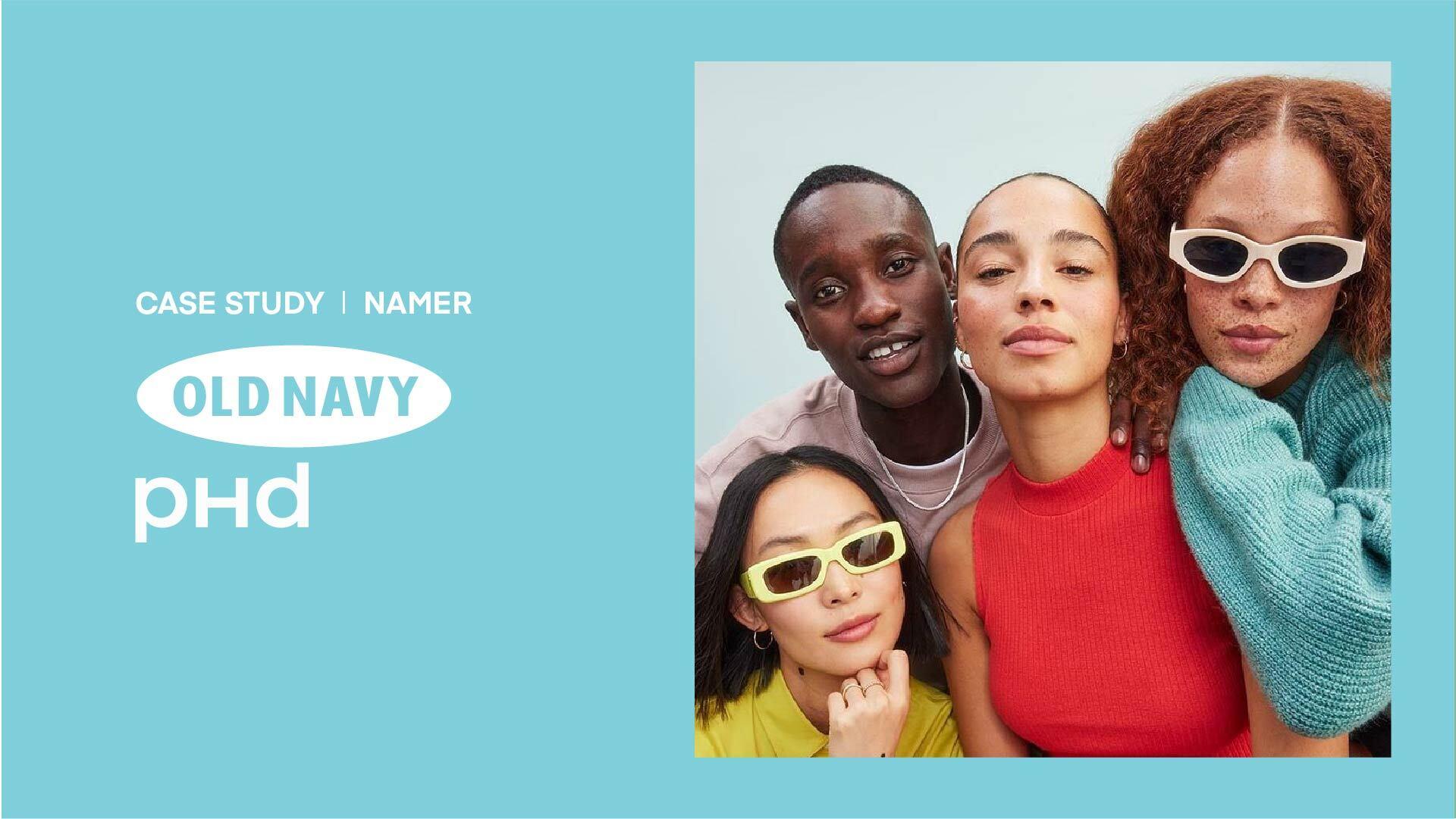 Blue background with four models to the right and the white text to the left "Case Study | NAMER - Old Navy + PHD"
